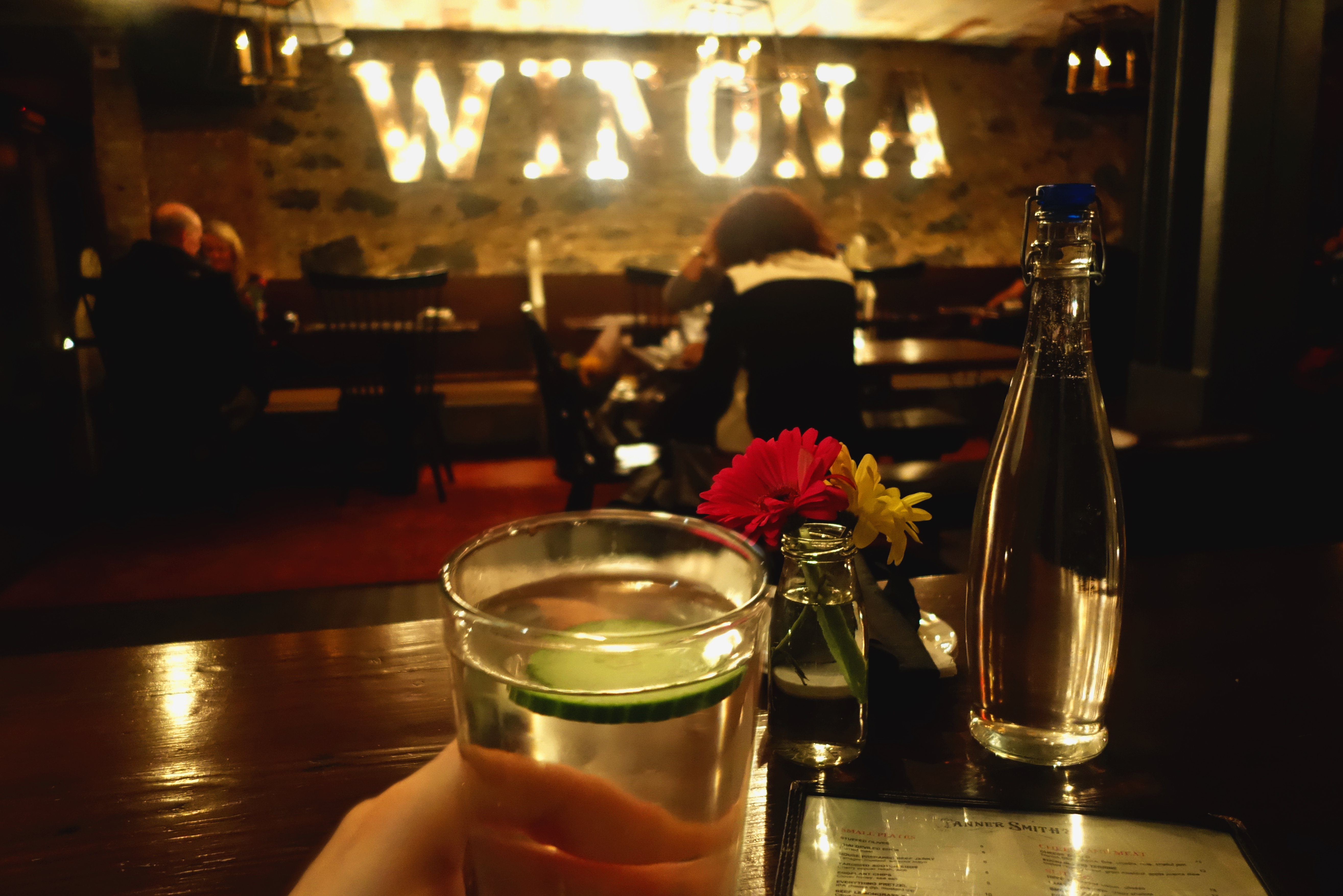 From the outside it just looks like a normal bar, but it is actually pretty huge inside, and very nicely decorated. You can tell that every detail was well thought out. The upstairs has a bar and lots of seating, but there is also a downstairs with a 2nd bar and even more seating. The upstairs and downstairs have their own feel. Tanner Smiths is known as a “house of cocktails”. They have some pretty interesting drinks on the menu, including one named Winona. I’ve heard they are great, just not for me. They do however have a ginger beer on tap that is amazing!!! I also love that they put slices of cucumber in the water ❤